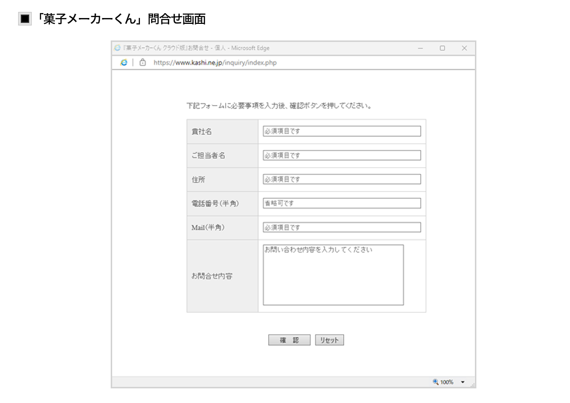 「菓子メーカーくん」の画面の中からサポートへ問合せできる |